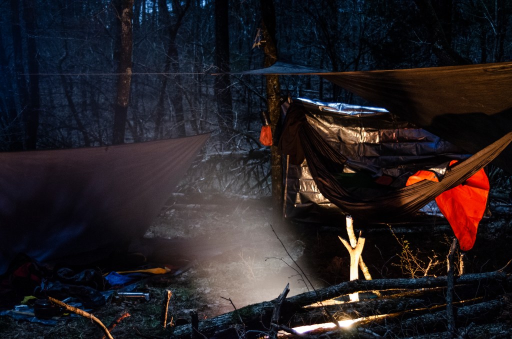 The Lean-To shelter type is characterized by a single beam or line attached to two points, usually a pair of trees, with branches or a tarp serving as a roof on one side. This type of shelter is typically supplemented by a heat reflector to keep warmth inside the shelter. This shelter is extremely versatile and can be set up using a mixture of materials.